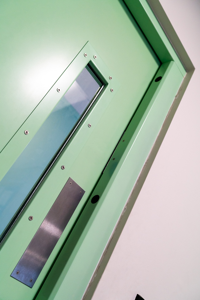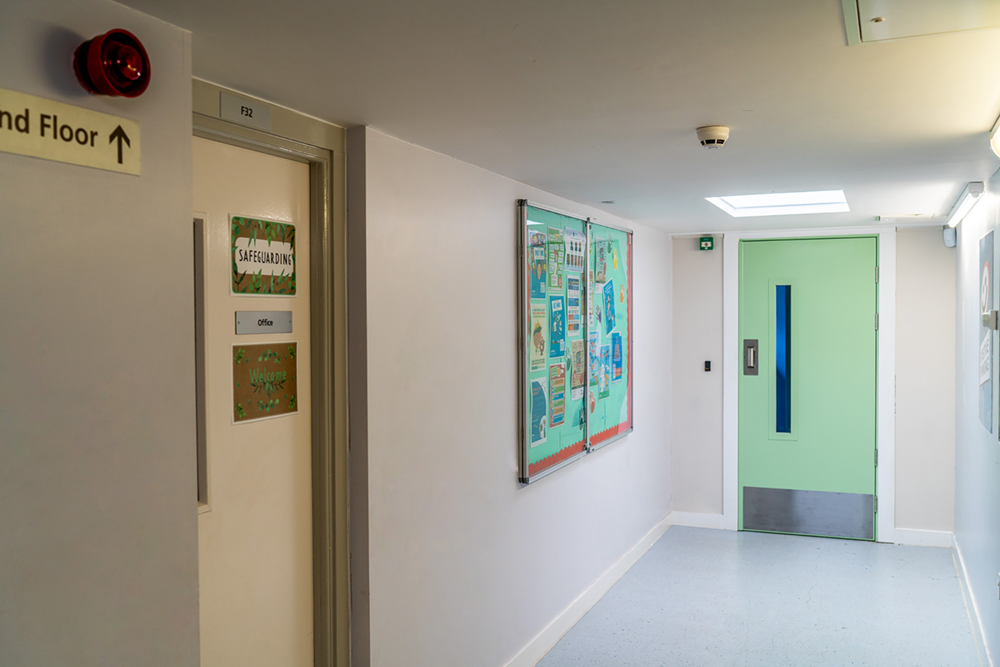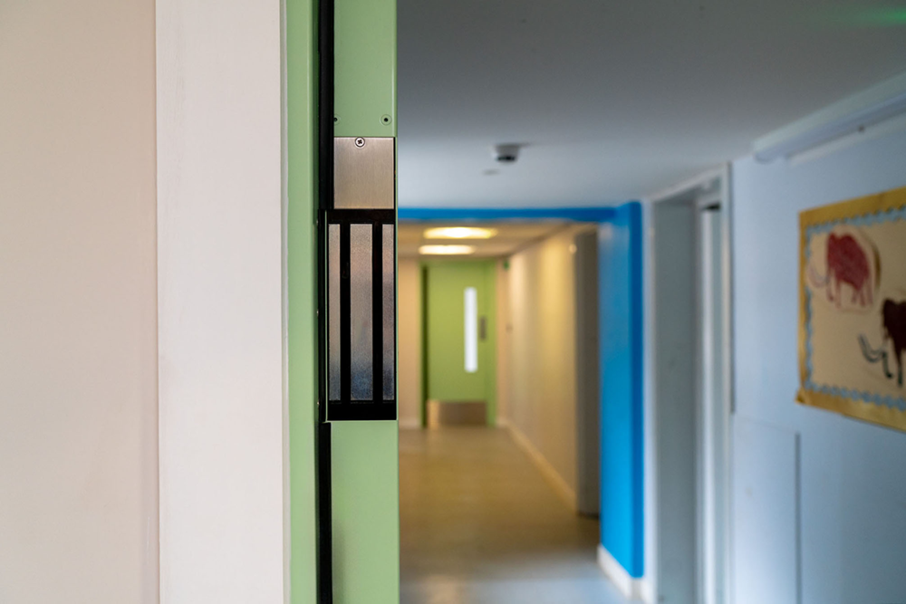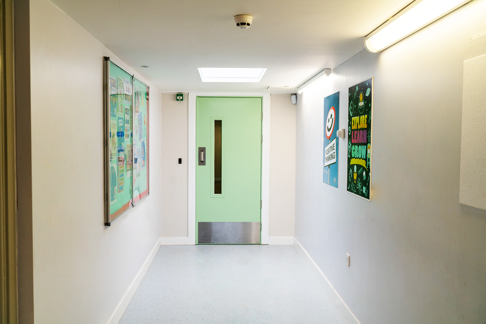 Aesthetically, the doors were finished in a pastel green powder coat (RAL 7034) to soften the look and reduce the institutional feel, creating a more welcoming and supportive atmosphere for students.